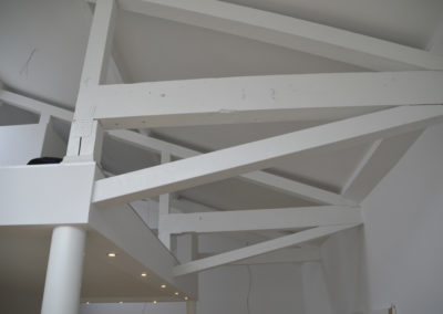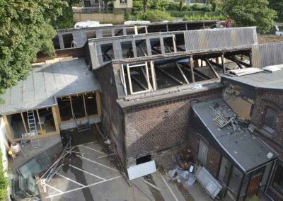 Die Backsteinhalle verfügt bestandsmäßig über eine Sheddachkonstruktion. Diese Konstruktion machen wir uns im Rahmen der völligen Kernsanierung zwecks kleverem Lichtkonzept zu nutze. Hierfür werden mehr als 25 Dachfenster (teilweise elektrischer Betrieb) der Marke Velux verbaut. Die Rahmenkonstruktion hierfür erstellt ein Zimmermannsbetrieb aus unserer Region.