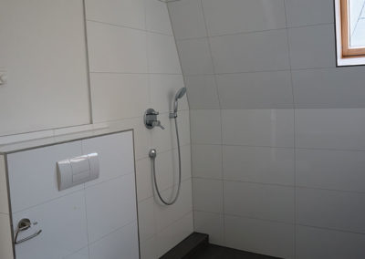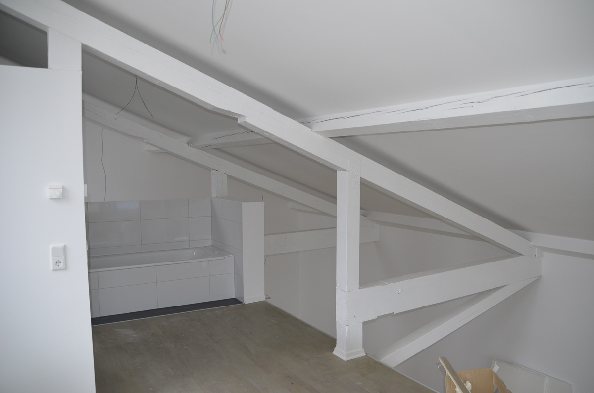 Die Sanierung erfolgt – wie bei allen Projekten – nach der aktuellen Energieeinsparverordnung. Hierfür erstellen wir einen komplett neuen Bodenaufbau, bestehend aus der abdichtenden Bitumbahn, der Ausgleichschüttung, einer Styrodurdämmung, dem Rolljet für die Fußbodenheizung und dem Heizestrich. Ferner erhält das Gebäude eine Zwischensparrendämmung und eine Fassadendämmung.