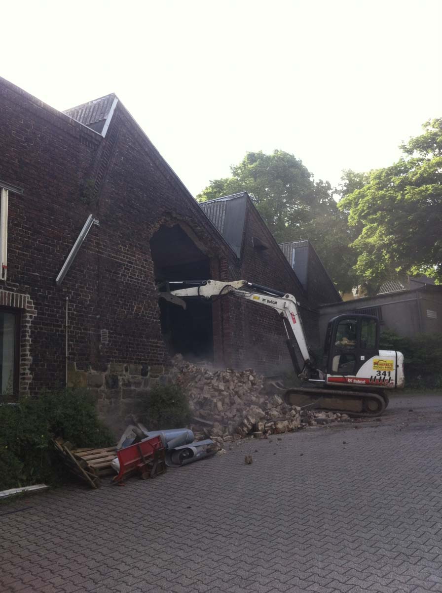 Die SÜD-WEST-Fassade wird jedoch komplett verglast. Hierfür musste in aufwendiger Weise die alte 60cm dicke Backsteinwand mit Diamantschleifern eingeschnitten werden, damit die Steinelemente dann mit dem Bagger entfernt werden konnten.